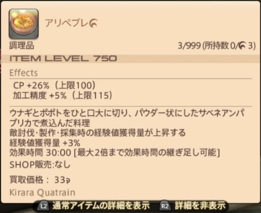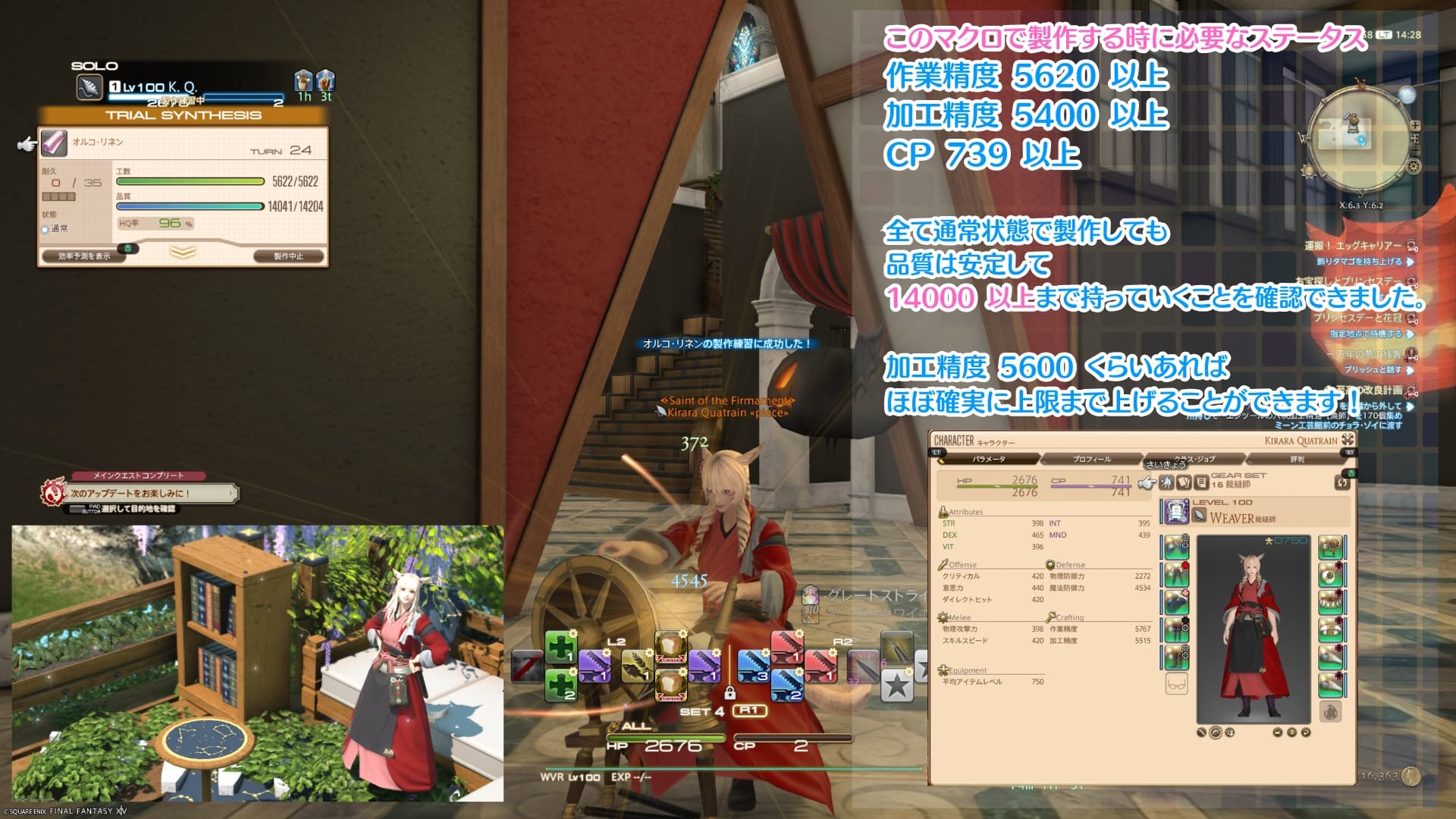 今回追加された中間素材(耐久35 工数5622)のレシピは、工数がややシビアになっていて、必然的に品質もシビアになる製作難易度になったかなあって感じました。