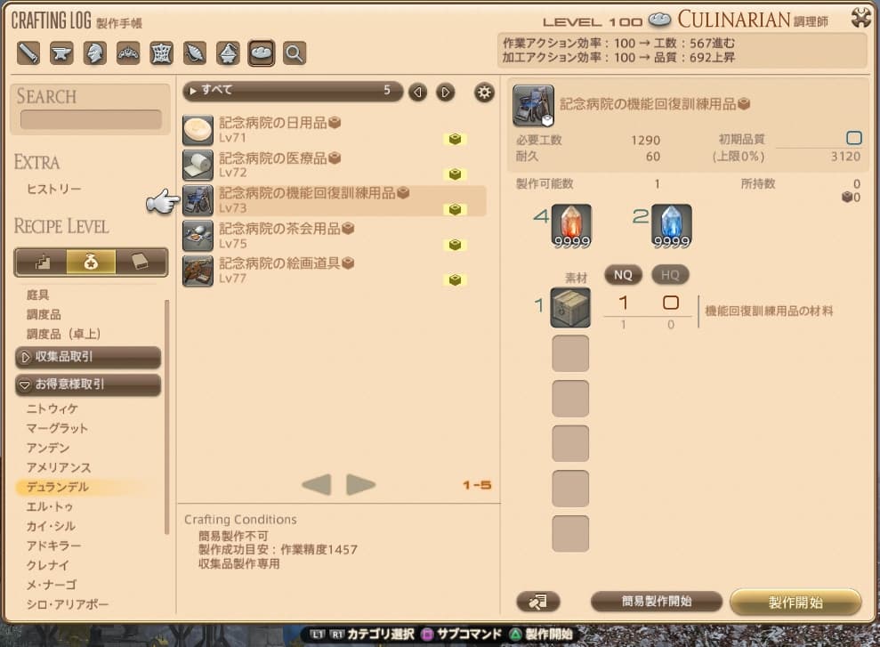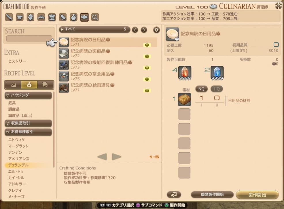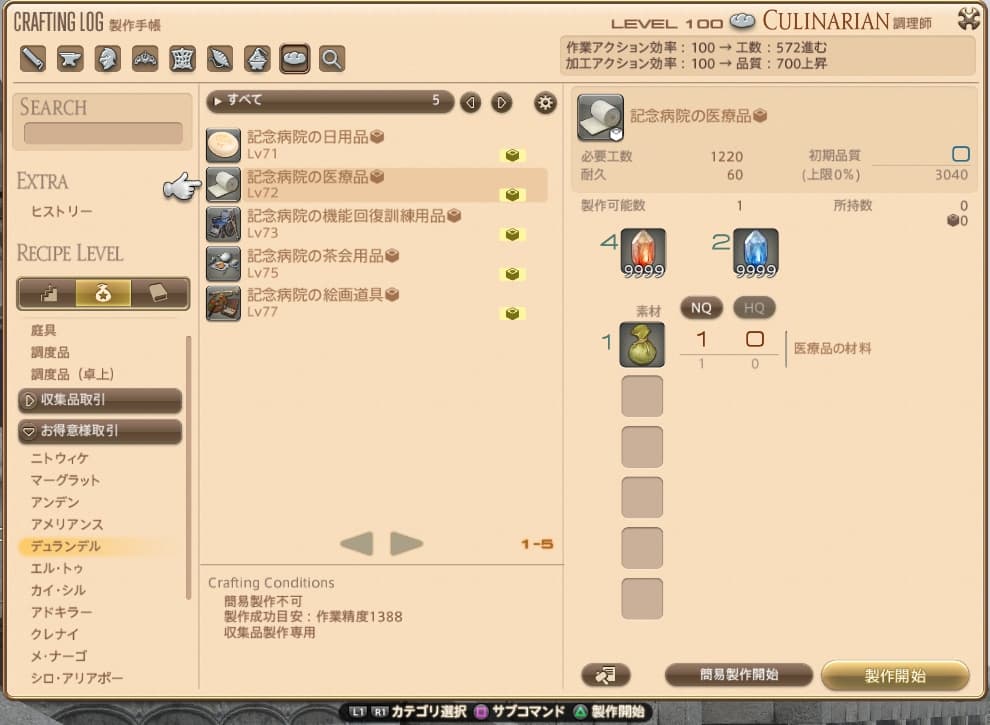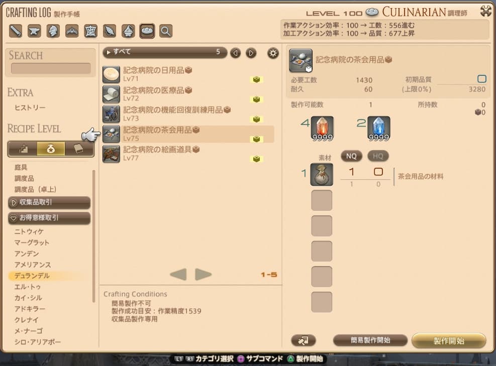 クラフターのレベルがレシピのレベル+10以上なら匠の早業が使用できるので、すぐに製作することが可能です。