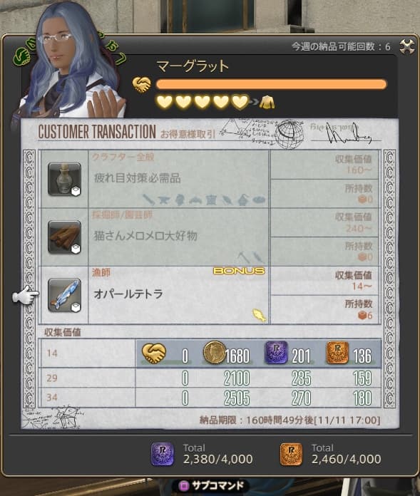 一週間に6回しか納品できませんが、その分、ランクも上がりやすくて納品時にもらえる経験値も多めなのでレベル上げにぴったりなコンテンツになっています。