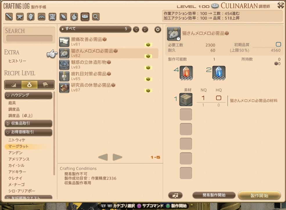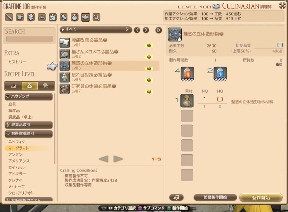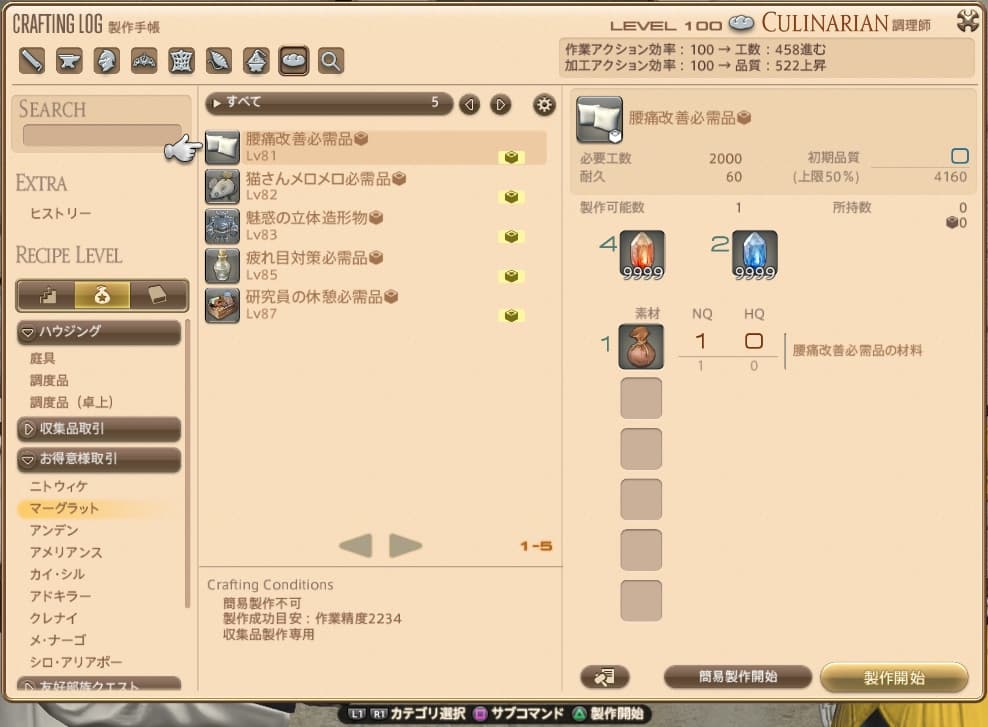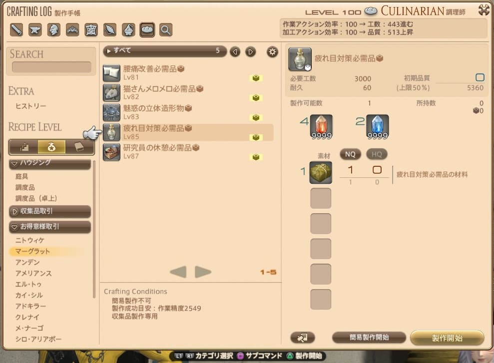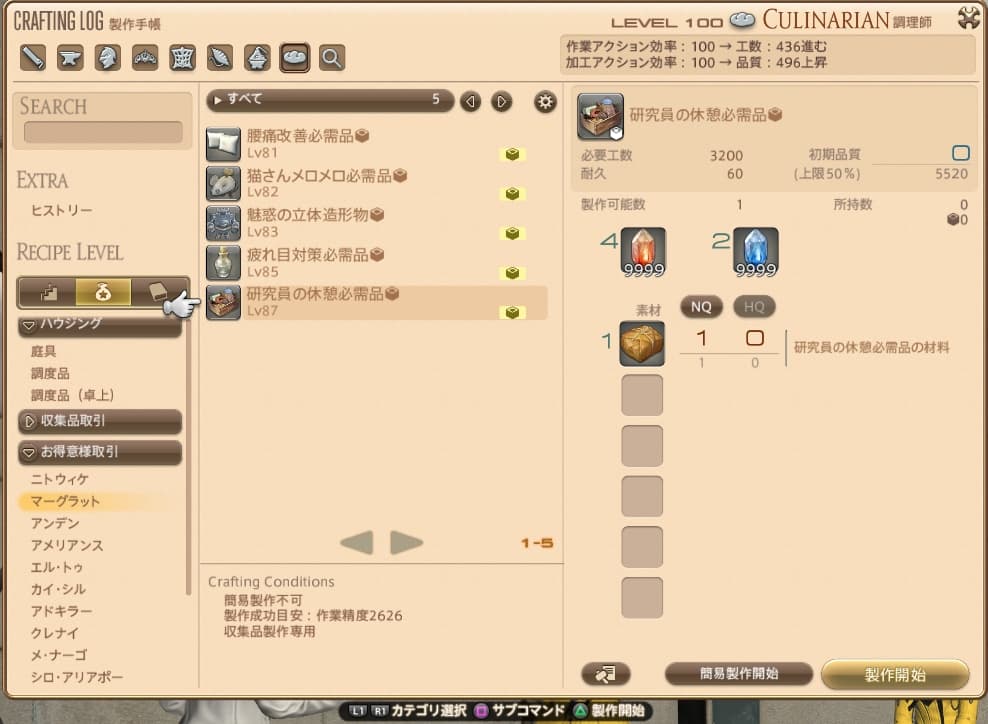 クラフターのレベルがレシピのレベル+10以上なら匠の早業が使用できるので、すぐに製作することが可能です。