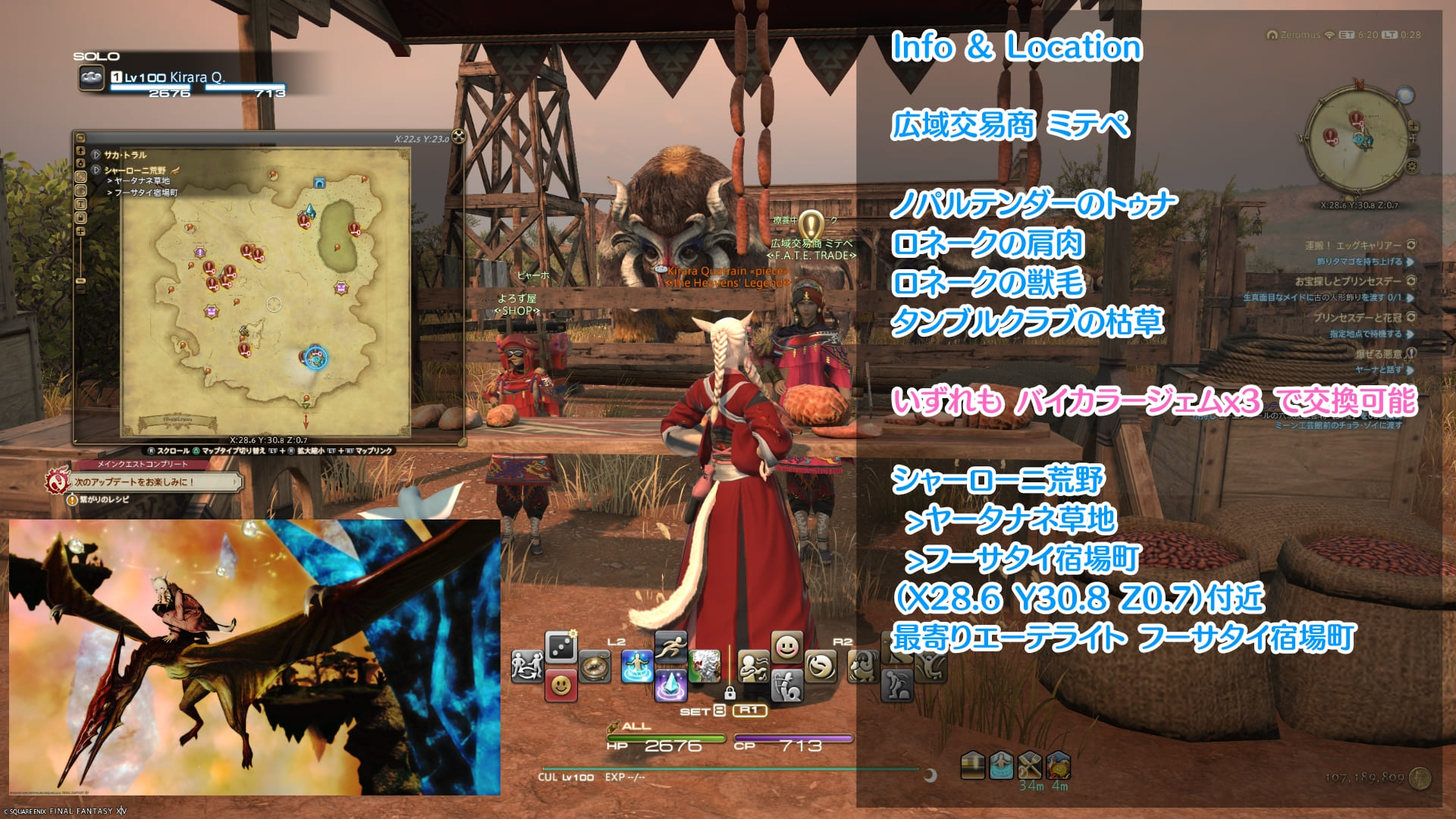 ロネークの肩肉はバイカラージェムでの交換が主な入手方法ですが、戦闘職のリテイナーがいるならリテイナーベンチャーで採ってきてもらうといいかなって思います。