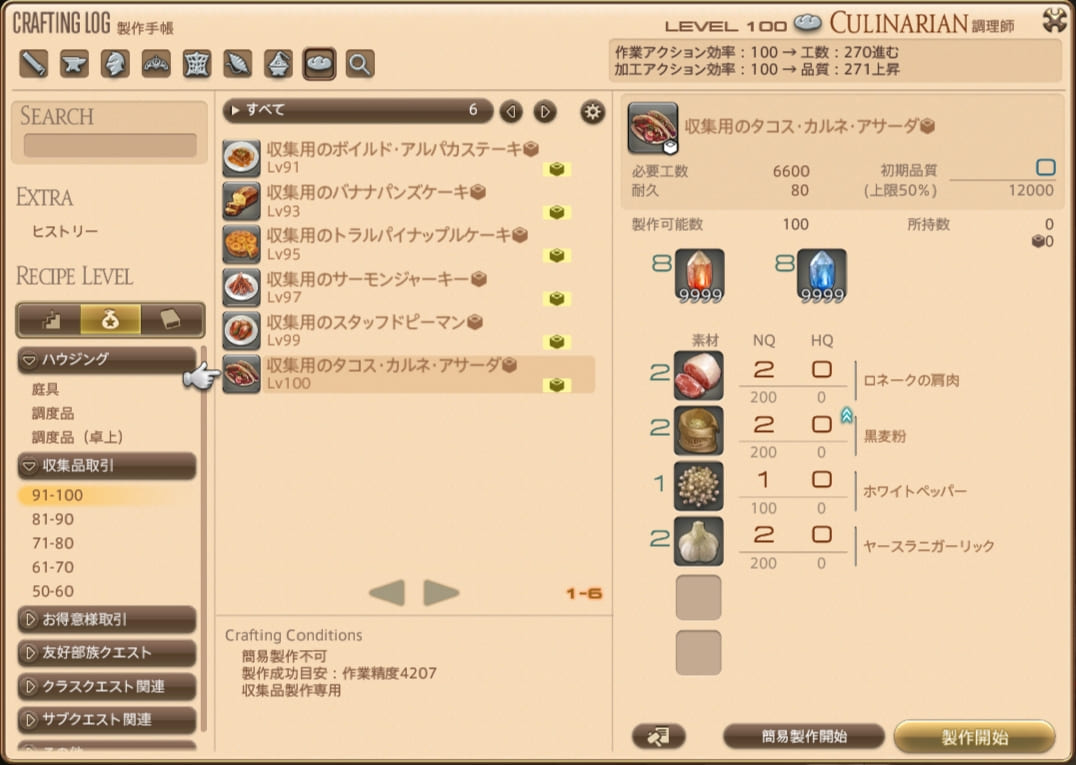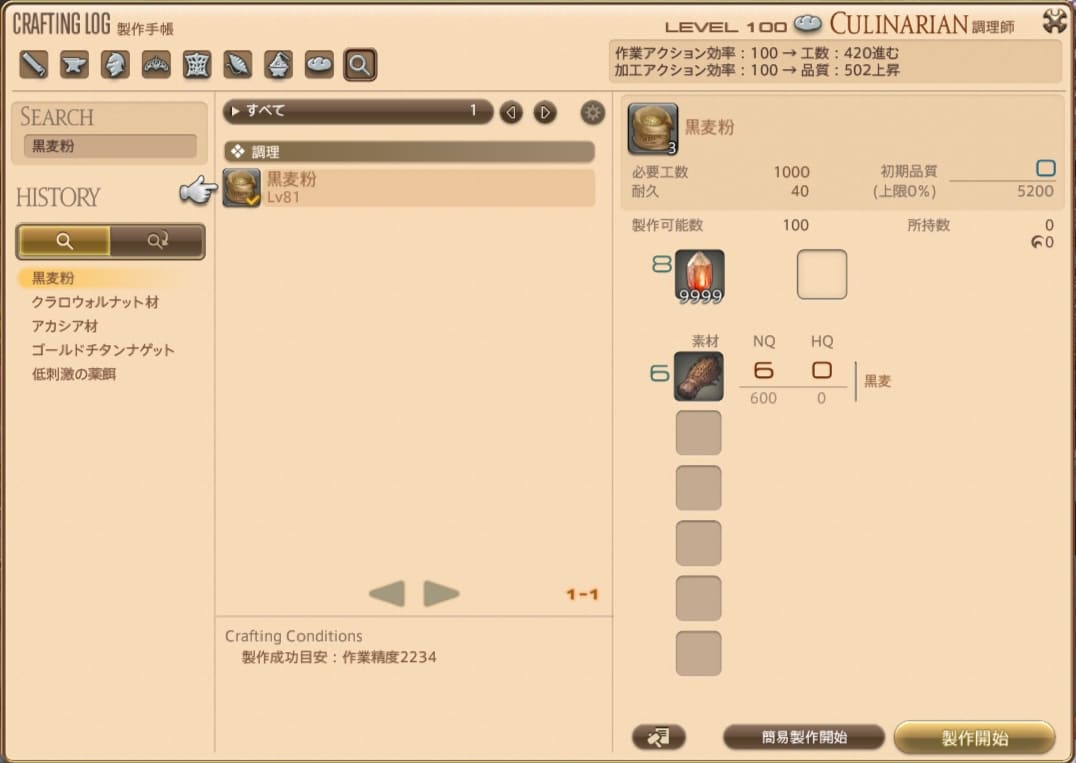 IL690装備を禁断しているとほぼ確実に必要収集価値1140(品質11400以上)に届くので、中間素材の黒麦粉は簡易製作で作っても大丈夫です。